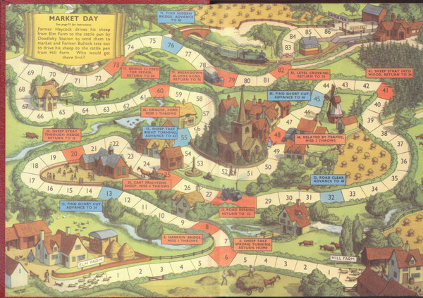 A game for two played with a dice and two counters. Throw a six to begin. One starts from Elm Farm and the other from Hill Farm and the first to reach the Cattle Pen, obeying the instructions on the way, is the winner.