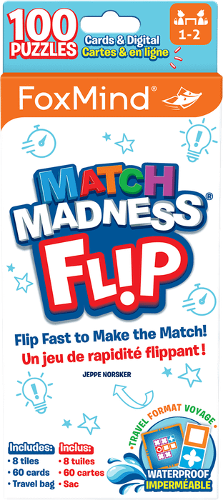 Flip tiles, test your speed and play anywhere with Match Madness Flip. This waterproof travel friendly version can be played solo or with two players. Includes 60 puzzle cards and 40 online challenges!