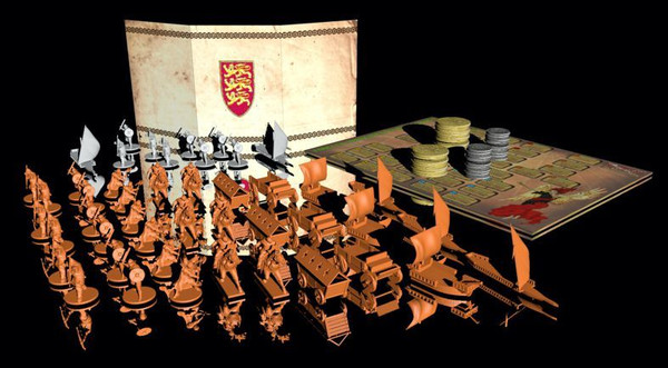 Each additional player expansion for MedioEvo Universalis includes 96 miniatures, 1 player board, 1 player screen and 25 additional metal coins.