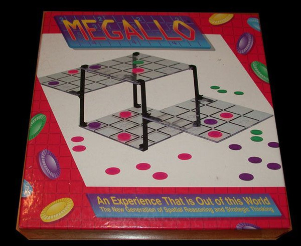 Megallo is a three-dimensional strategy game for two players. This is an alignment game, in which four playing boards form a winged-box with three levels. The objective of the game is to place game chips on the board in any one of six winning combinations. The unique design of the game requires players to use spatial reasoning and strategic thinking to outwit each other.
