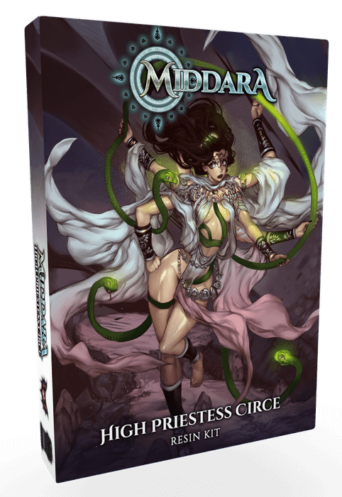 The High Priestess Circe kit comes with a beautiful Resin miniature (that will require assembly), an Initiative Card, two Item cards, and an Adventurer Card and an Intelligent Combatant Card.