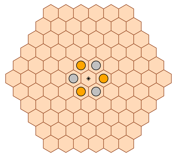 Mineway is a finite game built around sequences of line-of-sight connections (reminiscent of Sid Sackson's Network) but replacing the usual connection of opposite edges with a radial connection between the center and the board perimeter.