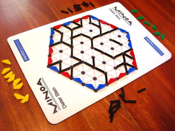 Minoa is an abstract game with connective play for 2-4 players on a hexagonal board (divided into 96 triangles) and black and colored sticks.