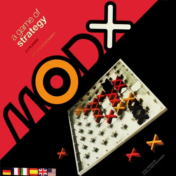 In the abstract strategy game MOD X, each player has 14 game pieces and 18 score markers, with the goal being to reach an established number of points (determined by the number of players). Players take turns placing a game piece on the board and trying to create scoring patterns – an "X", a "+", or a line, with each pattern requiring five pieces – while simultaneously trying to block their opponents from scoring with these same patterns.