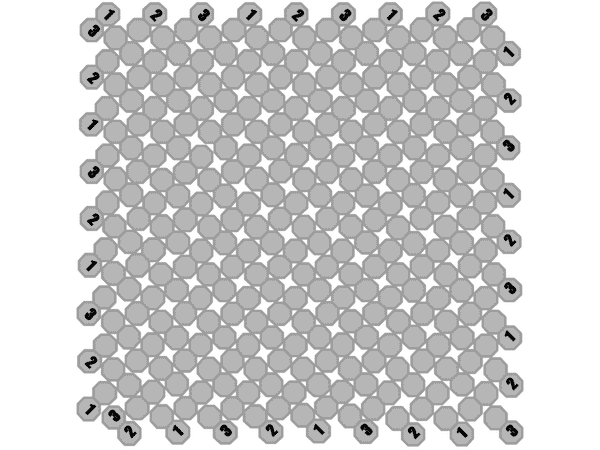 The board consists of two staggered 9x9 diamond plate like grids with cells running along the outer perimeter numbered 1-2-3-1-2-3-1-2-3 etc.