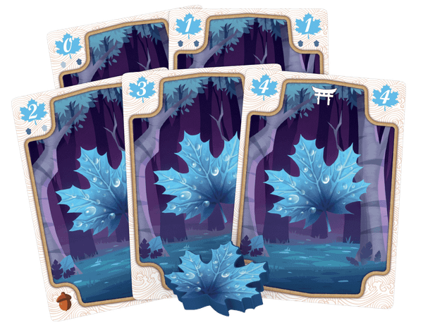 Morning Dew allows you to play Momiji with up to 5 players. Morning Dew cards can also be added to a 1-4 player game in place of another leaf type. The blue Morning Dew leaf cards can be collected in their own pile in a player’s personal area as usual, or they can be played as Wild cards/Jokers. When played as Wild you can add it to the top of any color of leaf card following the usual rules. You can also play any color of leaf on top of a blue leaf. You cannot have two or more leaf cards of the same color visible on top of your piled at the end of your “play leaf cards” action, and you can never play a blue leaf onto a closed pole showing the Torii symbol. If used as a Wild, immediately take the blue leaf token (-3 victory points at the end of the game).