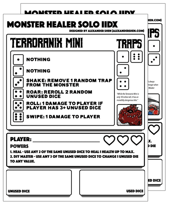 Monster Healer Solo IIDX is a print-and-play dice game that has you doing your best to subdue a hurt monster so you can perform your doctorly duties to save it. Two monsters included in this version!