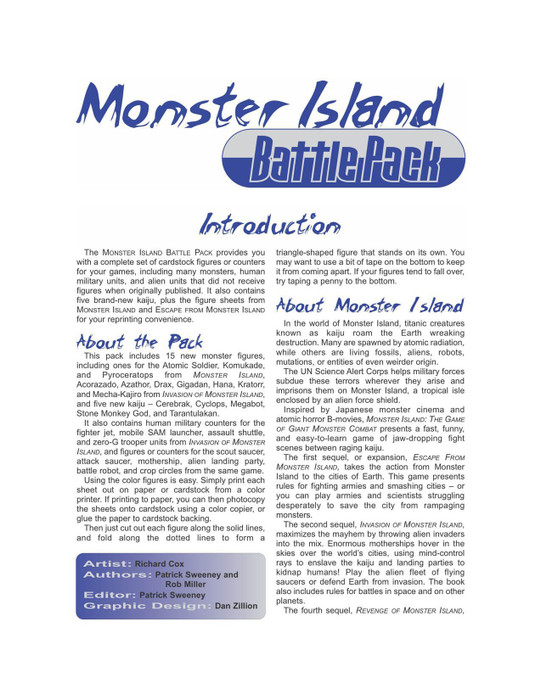 The Monster Island series of tabletop fighting games continues to expand. Keep up with the Monster Island Battle Pack, featuring printable color figures and counters for all the latest additions to the game, from deadly monsters to new human military units and alien invaders. Also includes complete dossiers and figures for five brand-new monsters created by Patrick Sweeney and Rob Miller, plus, for your reprinting needs, the original figure sheets from Monster Island and Escape from Monster Island.