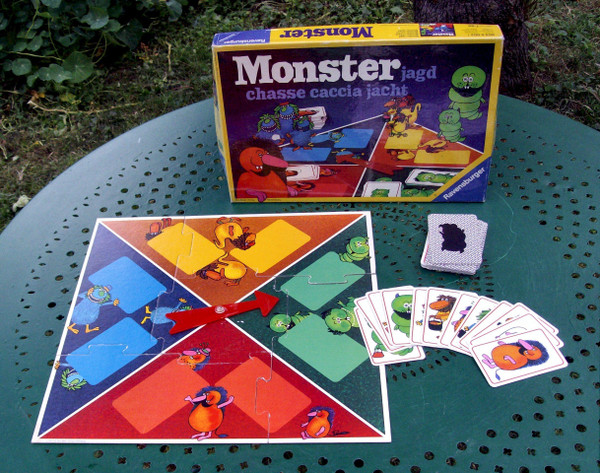 Reaction game for children where players spin an arrow on a board, then try to be the first to find a card that matches the type and color determined by the arrow. The cards depict monsters in four colors, and three different types: father, mother and children.