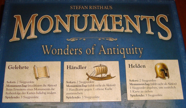 This is an expansion to Monuments - Wonders of Antiquity consisting of 3 tokens, one for each symbol of the base game. Helmets = Helden (Heroes) / Ships = Händler (Traders) / Scrolls = Gelehrte (Scients).