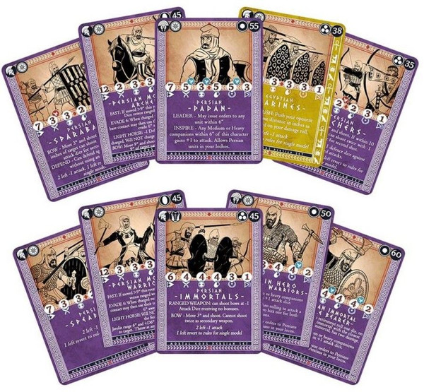 This set contains a total of 46 cards made up of Roster Cards to be used to build your Persian Sataba (warband), 10 Gift Cards specially designed to be used with a Persian force and a single Persian reference card.