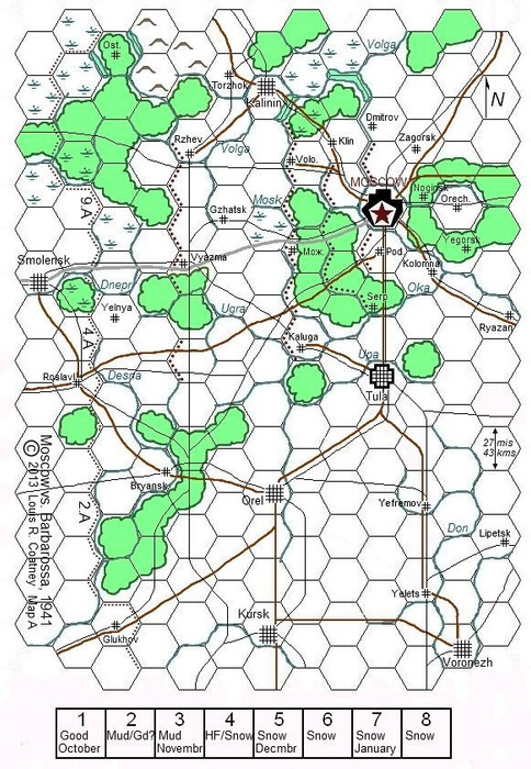 A small-scale (9 hexes from Smolensk to Moscow, 27mis/43kms per hex) Battle of Moscow game, MvB41 has 32 Russian and 22 German corps-to-army-level units, and takes 2-3 hours to play 8 half-month turns (or less, if Moscow is taken).