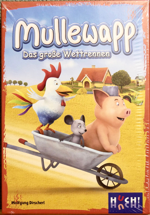 An animal race for 2-4 players from 4 years. Pig Waldemar, Franz von Hahn and Johnny Mauser with sheep Wolke against farm dog Bello. Who will reach the farm first? Each animal has its own lane. In the cooperative variant, dice are rolled - for the animal dice, one of the animals is drawn one step accordingly, then for the symbol dice, an animal tile of the back is revealed and the animal is drawn, everyone remembers the animal to be able to draw a desired animal later. If all animals are at the finish line before Bello, everyone wins together. For the competitive variant, each player is assigned one of the four friends, and the first animal at the finish line wins.
