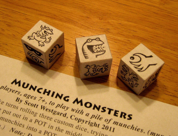 The game is played by rolling 3 custom dice (which have to be assembled from the files included here) in order to roll a MONSTER(s) which then can use the other 1 or 2 dice to perform an action. One-headed and two-headed MONSTERS can GRAB a treat, STEAL a treat, or EAT a treat, for each head they have. A player who GRABS takes a treat from the pot and puts it on their STASH plate, a player who STEALS can take a treat from the pot OR take a treat from another player's STASH. A player who EATS a treat puts it in their STOMACH CONTENTS bag and that treat can not be stolen by any other players. Rolling triples has special effects, like being caught stealing. After all the treats are gone from the pot, players score 1 point for each treat in their STASH and 2 points for each treat in their STOMACH CONTENTS bag. I suggest having at least 10 treats per player to play with. For fairness reasons, sometimes the players agree that if they don't roll at least one monster they can physically eat one treat from the pot.