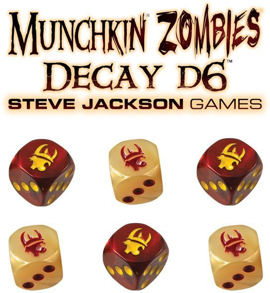 Munchkin Zombies Decay d6 features six custom six-sided acrylic dice previously available only in a limited release. Three of them are swirled pearlescent red with pus-yellow pips; three of them are swirled pearlescent ivory with blood-red pips, and all six feature a Munchkin head in place of the one. You want them so you can kill the monsters and take their stuff!
