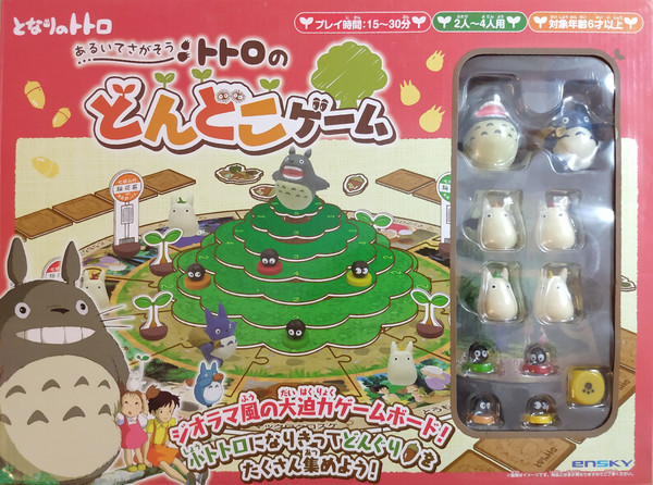 Board game contains 10 Totoro related figurines, big camphor three, tokens and many cards with beautiful drawings from original movie.