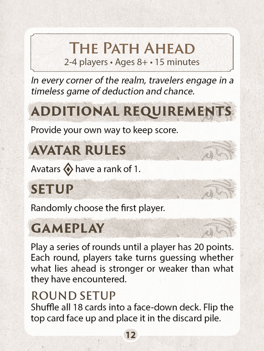The Path Ahead is a guessing game for 2-4 players that uses the Mysticana deck. Each round, the active player guesses whether the next card drawn will be stronger or weaker than the currently showing card (accounting for rank and suit). A correct guess moves play to the next player; an incorrect guess earns a consequence card. These may count against the player’s score if not used to make a set of matching consequences. At the end of each round, players add up any consequence cards they still hold and add it to their running score from previous rounds. The game is over when any player hits 20 points, with the lowest-scoring player the ultimate winner.