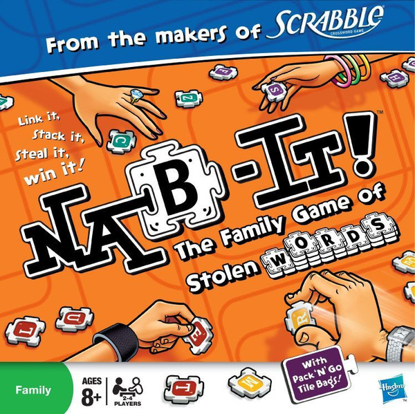 Nab-It! is reminiscent of the word game Upwords in that players can stack letter tiles on existing letter tiles in order to create new words, but there are three differences: (1) the game includes no board, (2) each player has her own set of tiles in a particular color, and (3) the player who has the highest or most tiles in a word scores one point for that word (no matter how long) once the game ends.