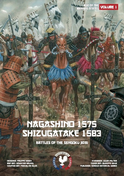 Nagashino 1575 & Shizugatake 1583 is the first volume of a serie dedicated to Sengoku jidai . It consists of a double-sided zone map, 216 beautifully illustrated counters, 24 pages rulebook - French and English - , one game aid and two scenarios. The scale is 300m per zone, 45 minutes per game turn and 500 men per counter. A game lasts 2 to 4 hours and is ideally for 2 players. It is an area movement game.