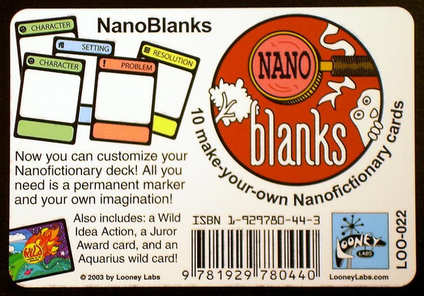 NanoBlanks are packets of do-it-yourself expansion cards for Nanofictionary (much like Fluxx Blanxx are for Fluxx). Each pack contains 10 semi-blank cards for you to be creative with: 4 Characters, 2 Settings, 2 Problems, and 2 Resolutions. Buy NanoBlanks!