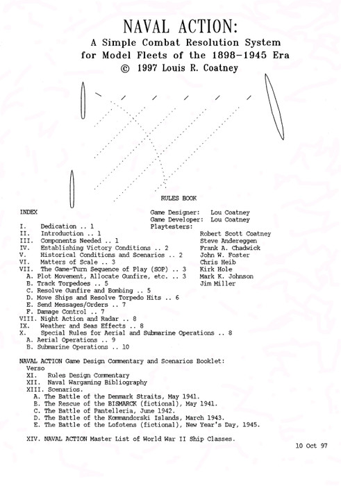 A relatively fast and simple naval miniatures (or boardgame, if you want to grid it) set of rules. Each simultaneous-movement turn is 5 minutes of real time. Floor scale is 1 inch per unit, while tabletop scale is 1 centimeter per unit. Ship statuses for all World War 2 ship classes are provided, as are 5 sample scenarios, including Denmark Strait, where Bismarck sank Hood.