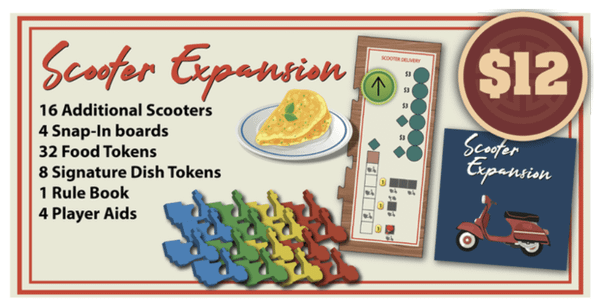 The Scooter Expansion will replace the after-hours scooter use in the base game and replace it with a much more robust delivery system using scooters. In this expansion, you will place your scooters out onto the city board for delivery bonuses. We will also introduce a NEW signature dish!
