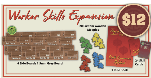 The Skills Expansion will give your workers asymmetrical skills. Each player will have the opportunity to give their workers skills to enhance their play. These skills are unique and once acquired you get to keep the power for the remainder of the game. This will add another crunchy layer of gaming goodness to the Night Market Experience.