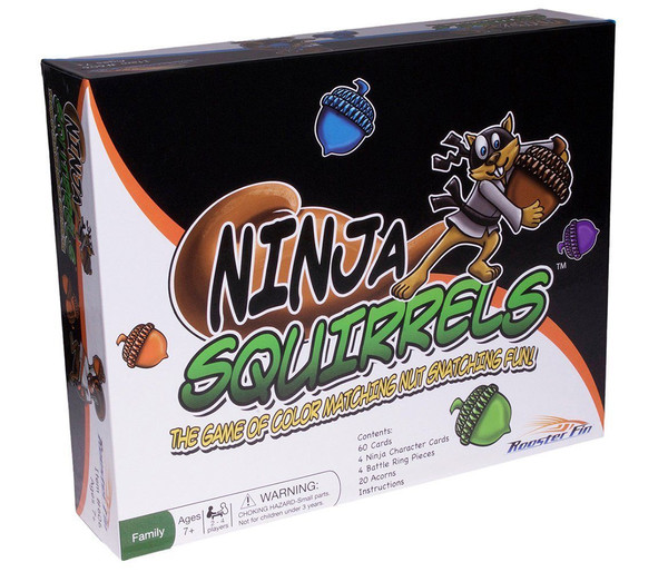 Ninja Squirrels is the game of color matching, nut snatching fun! Ninja Squirrels are fast food fighters. They race to gather acorns to fill their dens before the winter. To help them grab the most acorns, players take turns flipping cards. When there is a color match, be the first to snatch the correct nut. Collect the most acorns to win!