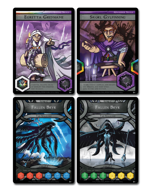 The Legend Skald obeys all rules for both Legends and Skalds. It is considered to be white, purple, red, green, blue, and yellow while it is in your hand. When played, first place an inheritance marker into it from your Saga, then it grants its Skald Embellishment. While in play on a family tree, it is considered white, purple, and the color of the inheritance marker on it.