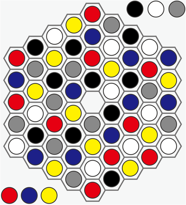 Each player is responsible for three colors each and moves a piece to an empty cell or removes a group of any of their pieces. The player who has a single group per his/her color wins the game.