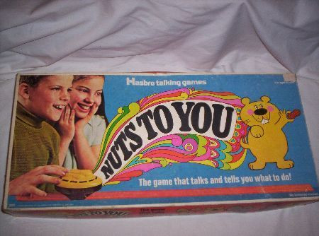 In this game, as one of the four animals, you try and collect the most nuts; the unique mechanism is that there is a talk device with a strip that will say a prescribed sentence back to you. It works sort of like a pull string dummy that has several phrases it can say. Interesting plastic peanuts you collect too ;-)