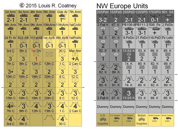 NOTE: Allied army headquarters units have been added and replace the "truck convoys" for supply. And 3rd Army -supplied units get a +1 shift in attacking combat odds. :-)