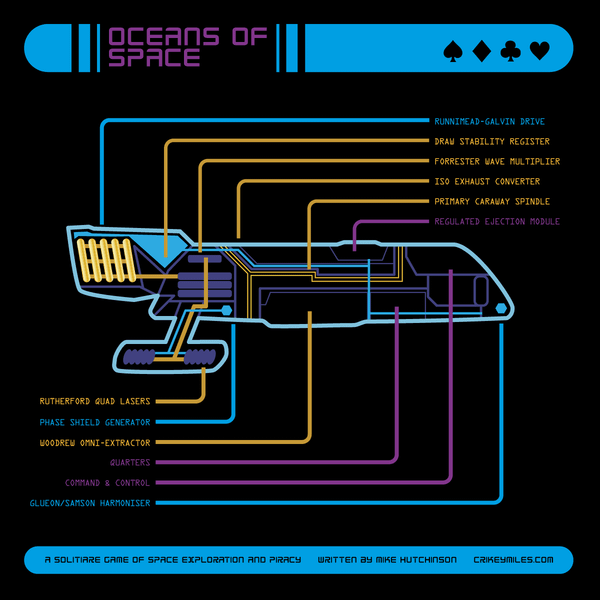 Oceans Of Space is a print and play solitaire card game that requires only a pack of regular playing cards, a printed record sheet and a pencil to start your new career as an intergalactic rogue trader and pirate.