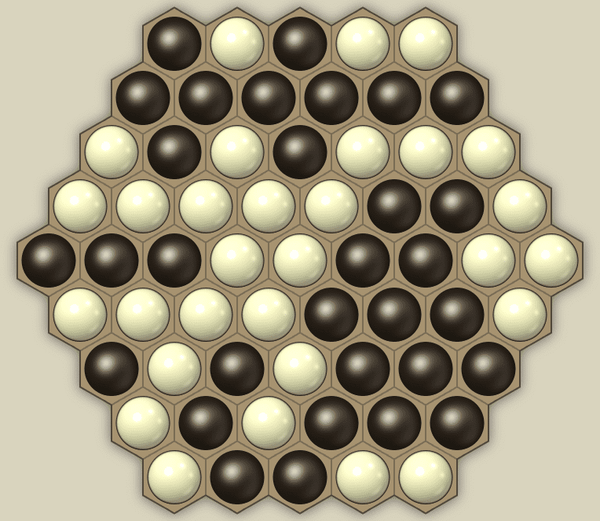 When the board is full, the player with the lower score wins. Your score is the sum of the values of your groups. If there is a tie, whoever has fewer groups wins. If the tie persists, White wins.