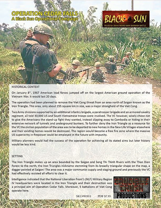 This 15 page PDF uses the BLACK SUN skirmish rules in a strictly historical operation led by US Army forces in the Iron Triangle area of Vietnam. It adds larger game play elements to the Black Sun universe. Provided are new Force Cards, New "What the...?!" Cards (ready to be printed and played with) and a three scenario campaign that can be enjoyed by multiple players.It also provides new rules including a Forward Observer and mortar team, starting fires and a Scenario Point objective system to determine the winner of a multi scenario campaign.