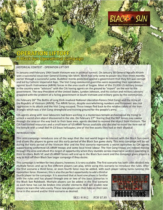 This Operational Campaign is intended for use by new players to the Black Sun universe and introduces background and story elements of horror to the players. This three scenario mini campaign includes new Force Cards for many different factions, new "What the...?!" Cards (ready to print and play) and some new advanced rules including veteran warriors. If you were part of the Black Sun Kickstarter you will have many of the troops needed for this game.