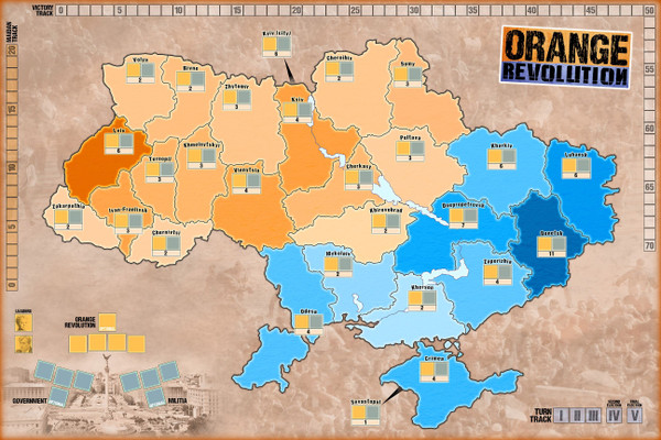 Orange Revolution is a block CDG game that pits Viktor Yushchenko against Viktor Yanukovych. Orange Revolution puts you into the revolution with its tense, thematic gameplay. Whether campaigning, attempting assassinations, or drumming up protesters to the Maidan, the many varied options will ensure each game is different — and with five total turns, the game is playable in 90-120 minutes.
