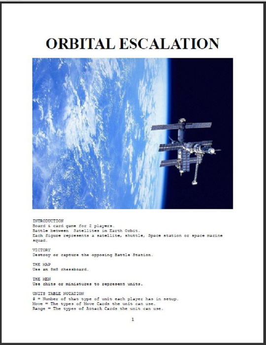 "Board & card game for 2 players. Battle between Satellites in Earth Orbit. Each figure represents a satellite, shuttle, space station or space marine squad. Victory: Destroy or capture the opposing Battle Station."