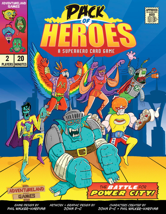 Pack of Heroes is a two-player card game set in a fun parallel universe of vintage comic books. Each player picks his team from the 30 different heroes in the game, then takes on his opponent in an exciting tactical battle with all sorts of crazy super powers! Combat is resolved with the unique "power card" system, which is designed to have all the excitement of dice-based combat but with far less randomness. Whoever has the last hero standing wins control of Power City!