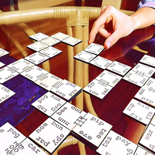 Components: The game comes with 112 lasercut, wooden tiles, each containing four 3-letter words.