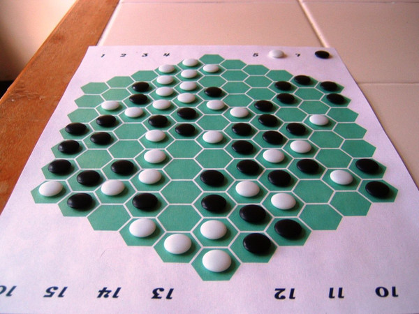 Papagra is a perfect-information abstract strategy game for two, played with Go stones or glass beads on a hexagonal grid. In the game, opponents try to form what are called "matched groups". A matched group is a group of connected pieces, the size and shape (but not necessarily orientation) of which match the size and shape of a connected, enclosed group of empty spaces somewhere on the board. The player who forms the largest matched group during the course of the game is the winner. Papagra is a brain burner that rewards strong pattern recognition and visuo-spatial skills.