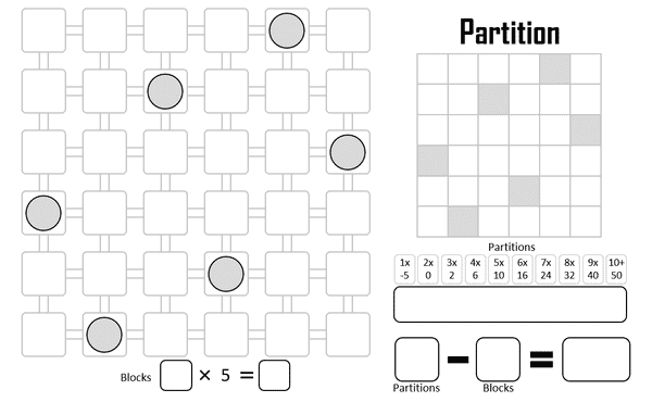 Each turn, 3 six-sided dice are rolled. All players simultaneously split those dice into two groups - one pair and one single die. The pair is placed on the larger grid where adjacent spaces must match at least one number. The single die is placed on the smaller grid, where players are trying to form areas of identical numbers to score points. After 30 rolls, the game ends. Connections on the larger grid that do not have adjacent matching numbers are "blocks" and lose points. Areas of identical numbers on the smaller grid gain points. Highest score wins.