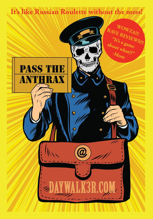 4-12 players compete in a game of high-stakes hot potato using a variety of movement-based cards to pass letter cards to one another. Letters that may or may not have deadly anthrax in them!
