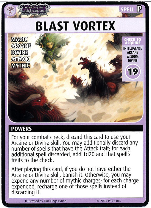 For your combat check, discard this card to use your Arcane or Divine Skill. You may additionally discard any number of spells that have the Attack trait; for each additional spell discarded, add 1d20 and that spell's traits to the check.