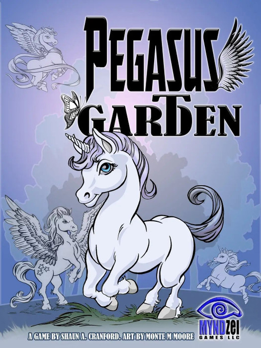 Pegasus Garden is a dexterity or "kinetic" game of card flipping and set creation. The theme is a garden party for mythological unicorns and winged horses. From 2-4 players may play the game and it takes about 10 minutes per player to complete. The goal is to get as many of your faction's beasts to the party safely. Players take turns flipping or dropping their cards onto the play field, attempting to create sets of their faction that will score points. Players may build their own score or attempt to foil their opponents by changing/removing their opponent's sets. Along the way, party goers may help each other get to the party, or perhaps get distracted by pretty butterflies and miss the party altogether.