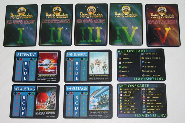 The cards show different planets, star systems, mutants with psi-talents, other persons, troops, spaceships, fleets, accessories, event cards and galactic riddles. There is also an action card deck to randomize the fights someway.