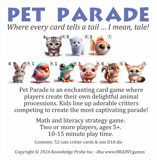 Pet Parade is an enchanting card game where players create their own delightful animal processions. Kids line up adorable creatures and compete to create the most captivating parade!