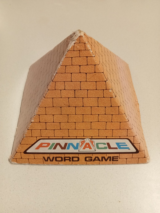 A game for 2,3 or 4 players in which interlocking words are formed from coloured letters printed on plastic pyramids that enable them to be seen from all four sides of the playing area at once. The game is played in two stages, the construction stage and the reconstruction stage. The first player to reconstruct all his pyramids ends the game. The player who has reconstructed the most pyramids is the winner.
