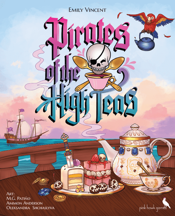 Pirates of the High Teas is a whimsical set collection game in which players are pirates competing to win their Captain's treasure by serving the most delicious afternoon tea. Players collect and match dishes with tea cards to serve the Captain a perfect meal. To acquire these dishes and teas, players select actions through a strategic worker placement mechanism on the pirate ship that determines turn order and number of cards.