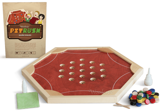PitRush is an action-packed game of skill in which players try to capture the pits of the game board with their disks in order to earn the most points. Players take shots by flicking their disk with their finger. Opponent disks can be struck off, and pits can be taken over by stopping on top of the disk in the pit. Players score points based on the distance of the hole they occupy (or cover) from their shooting location on the edge of the board.